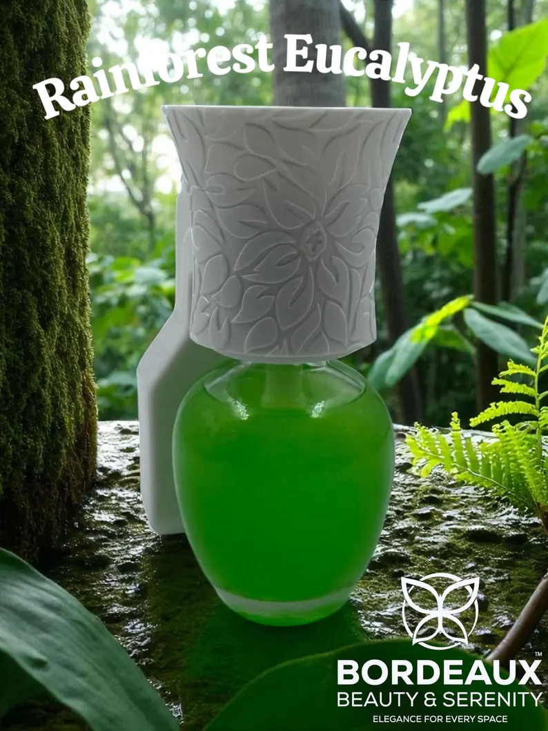 Awaken your senses with Rainforest Eucalyptus, a signature plug-in fragrance from the Bordeaux. Beauty. Serenity Collection by The Moore Body Agency. This invigorating blend of crisp eucalyptus and grounding forest notes fills your home with freshness and clarity. Designed for continuous scent release, it’s safe, easy to use, and perfect for bringing the essence of nature indoors.