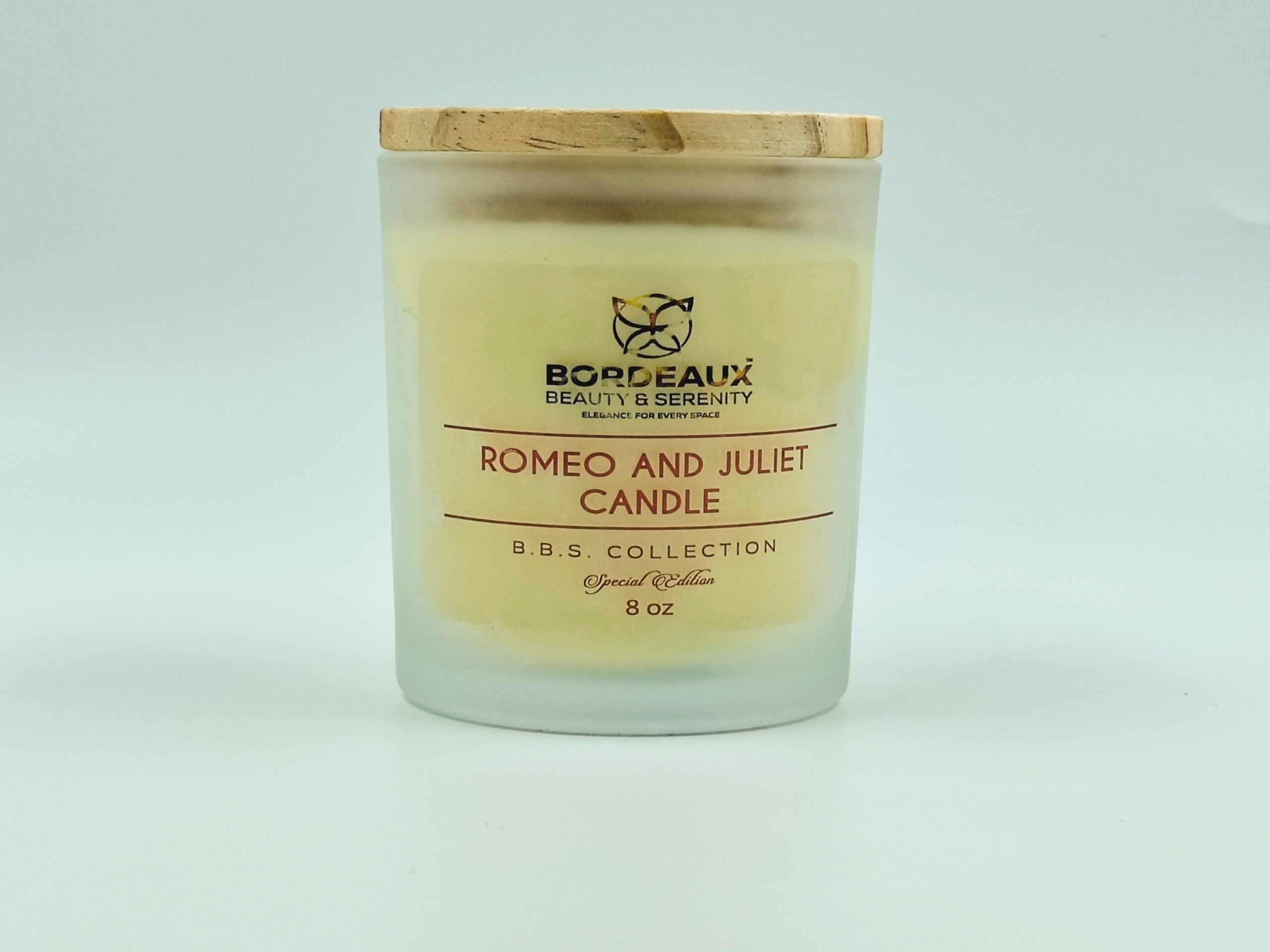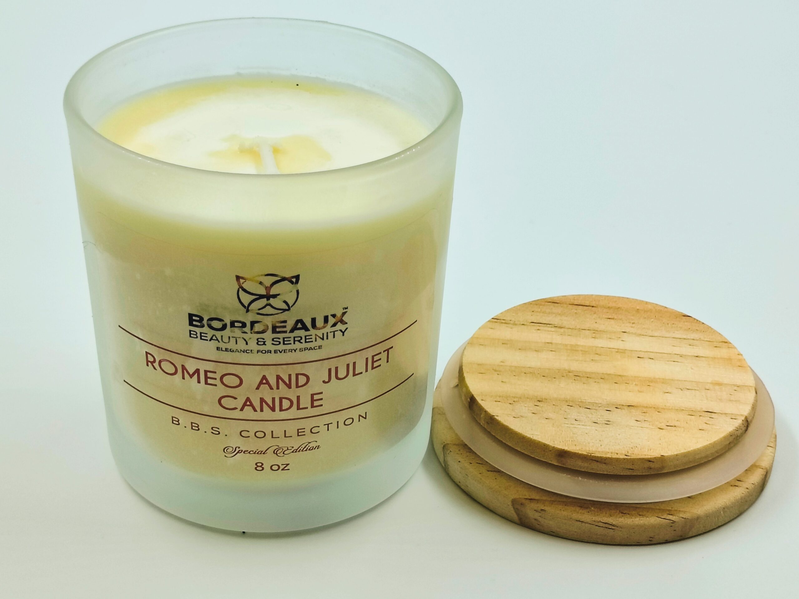 Experience the rich essence of Romeo & Juliet with this 8 oz soy candle from the Bordeaux Beauty Serenity collection by The Moore Body Agency. Each candle is hand-poured in small batches with natural soy wax, essential oils, and dual cotton wicks for a consistent burn. The fragrance combines ylang ylang, grapefruit, sweet orange, and vanilla to create a warm and inviting ambiance. Encased in a frosted glass jar with a wood-style lid, it delivers both fragrance and a modern decorative touch for your space.
