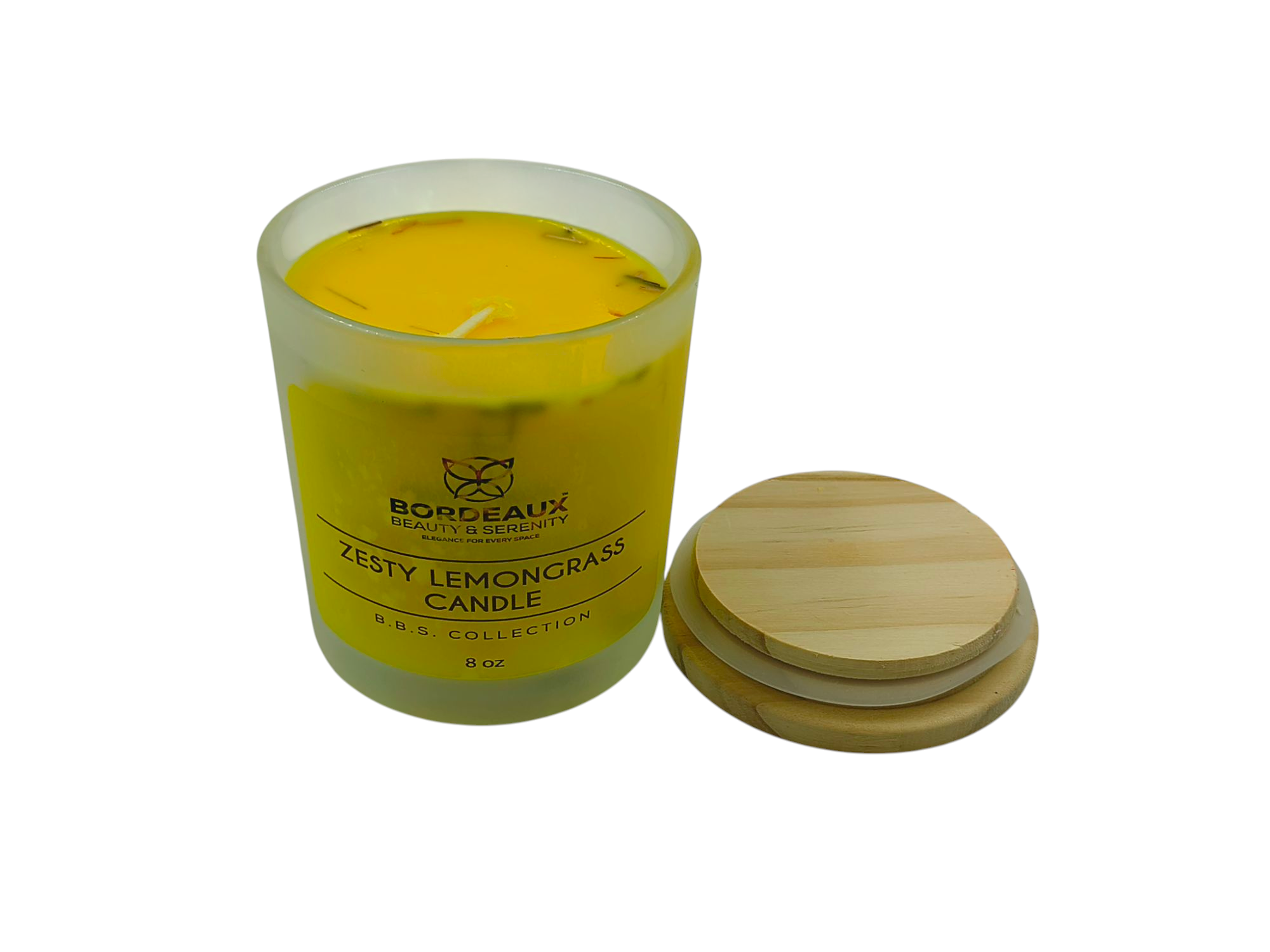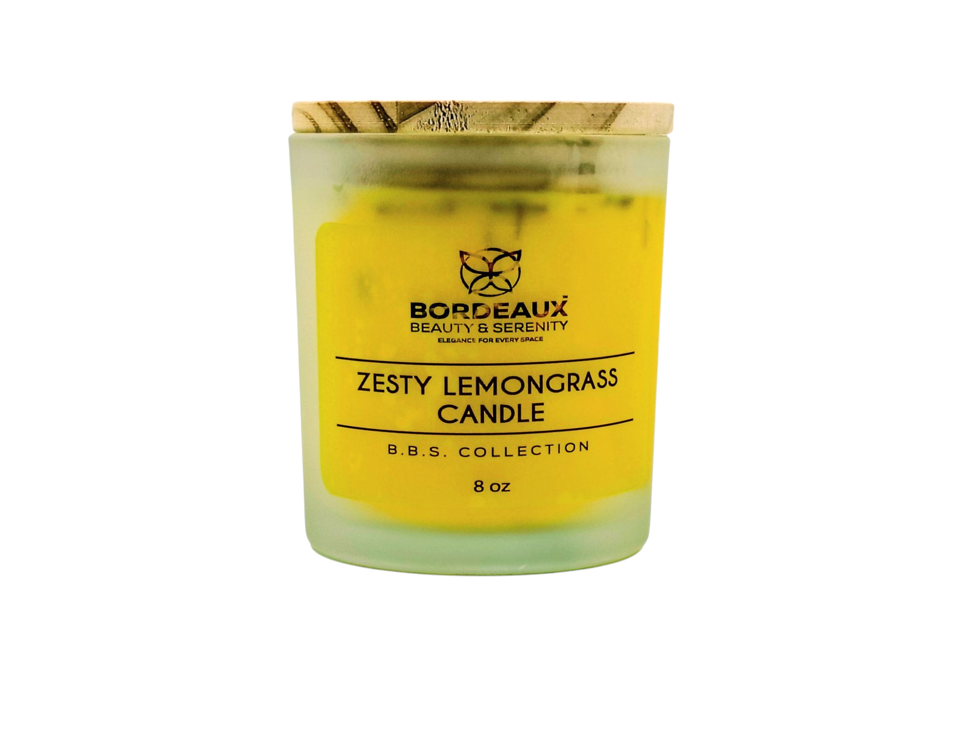 Experience the refreshing essence of Zesty Lemongrass with this 8 oz soy candle from the Bordeaux Beauty Serenity collection by The Moore Body Agency. Each candle is hand-poured in small batches with natural soy wax, essential oils, and dual cotton wicks for a consistent burn. The fragrance combines bright lemongrass, crisp verbena, and light airy notes to create an uplifting ambiance. Encased in a frosted glass jar with a wood-style lid, it offers both fragrance and a modern decorative touch for your space.